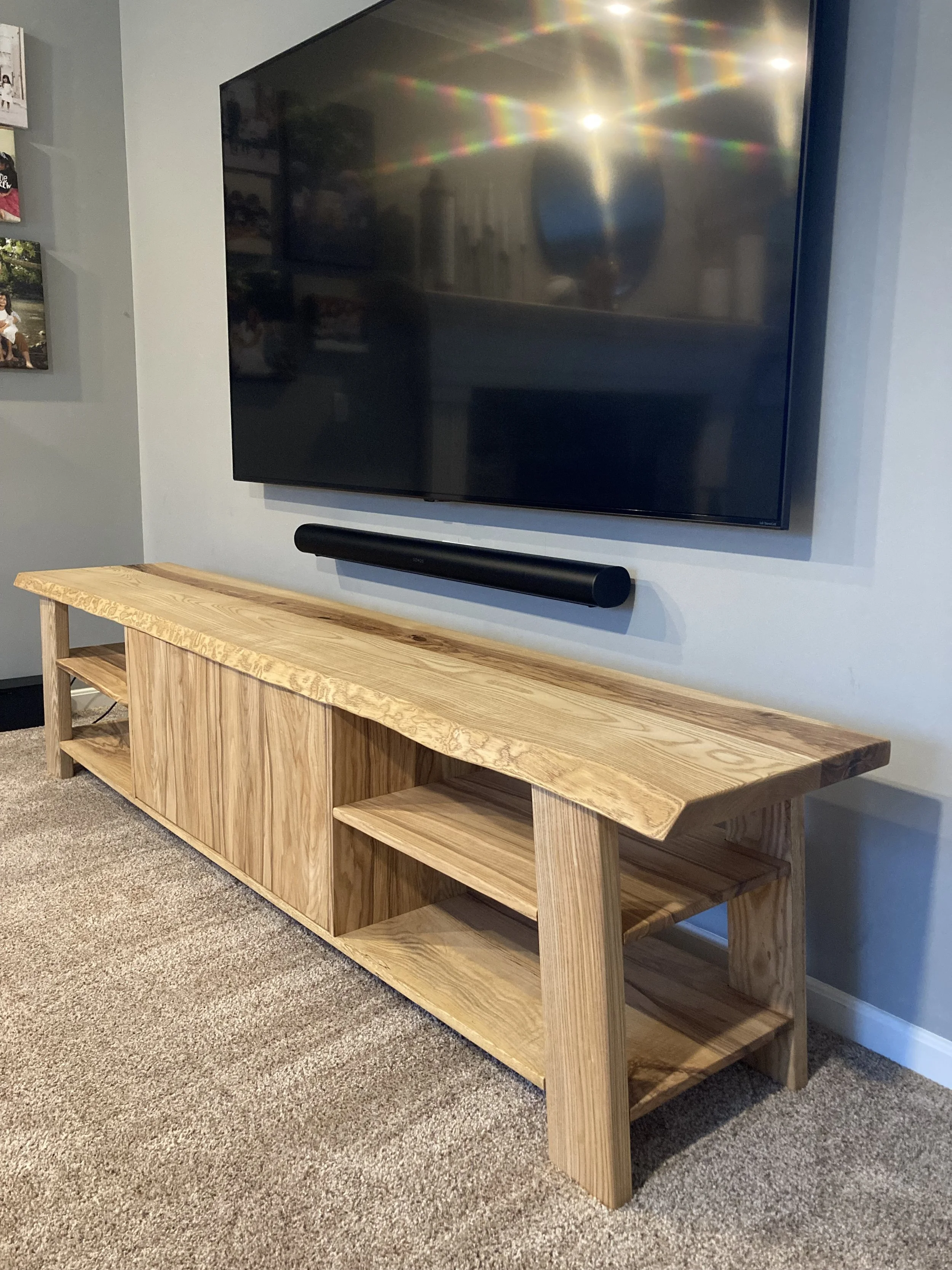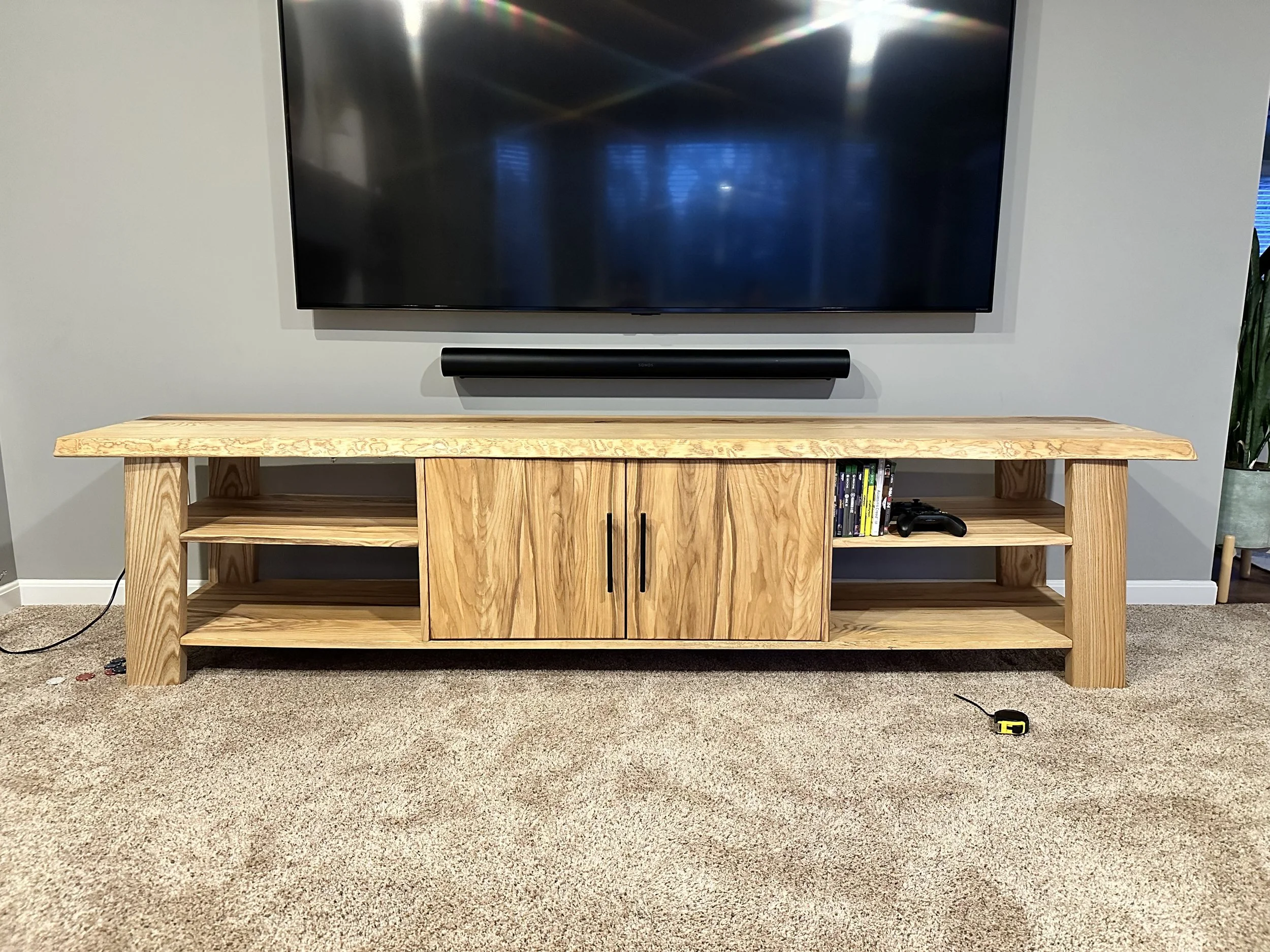 Solid Ash Media Unit The Serras have five young kiddos and wanted living room furniture that could take a beating. Together with Mr. Serra, we designed this 8’ Media Unit / TV Console to fit all of their needs.