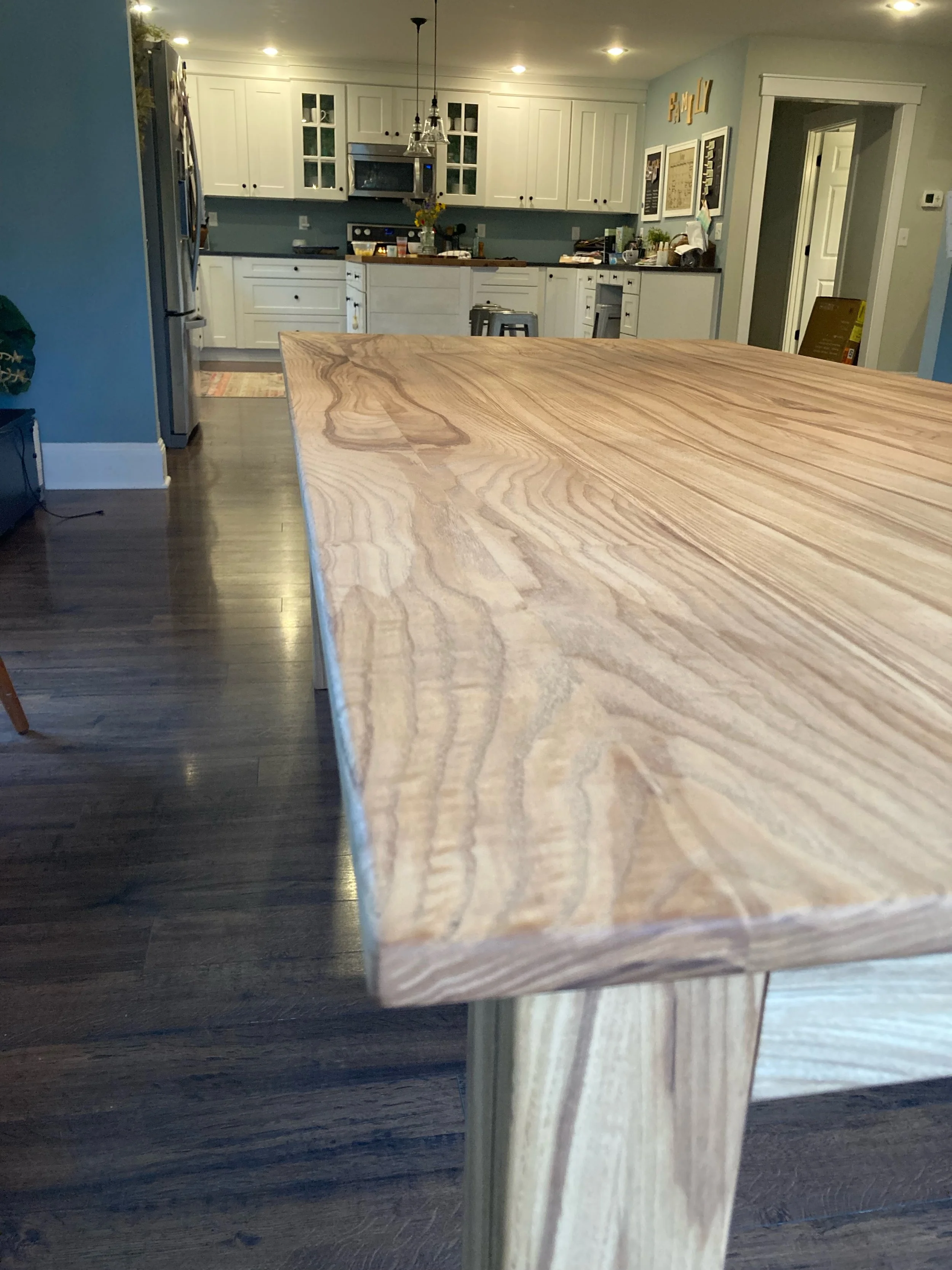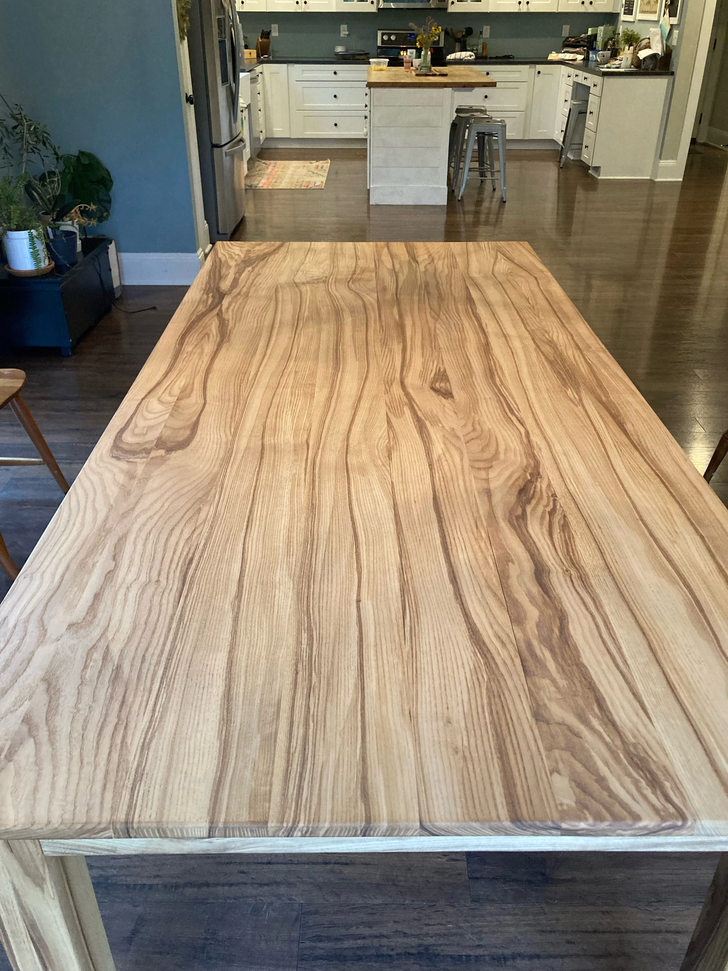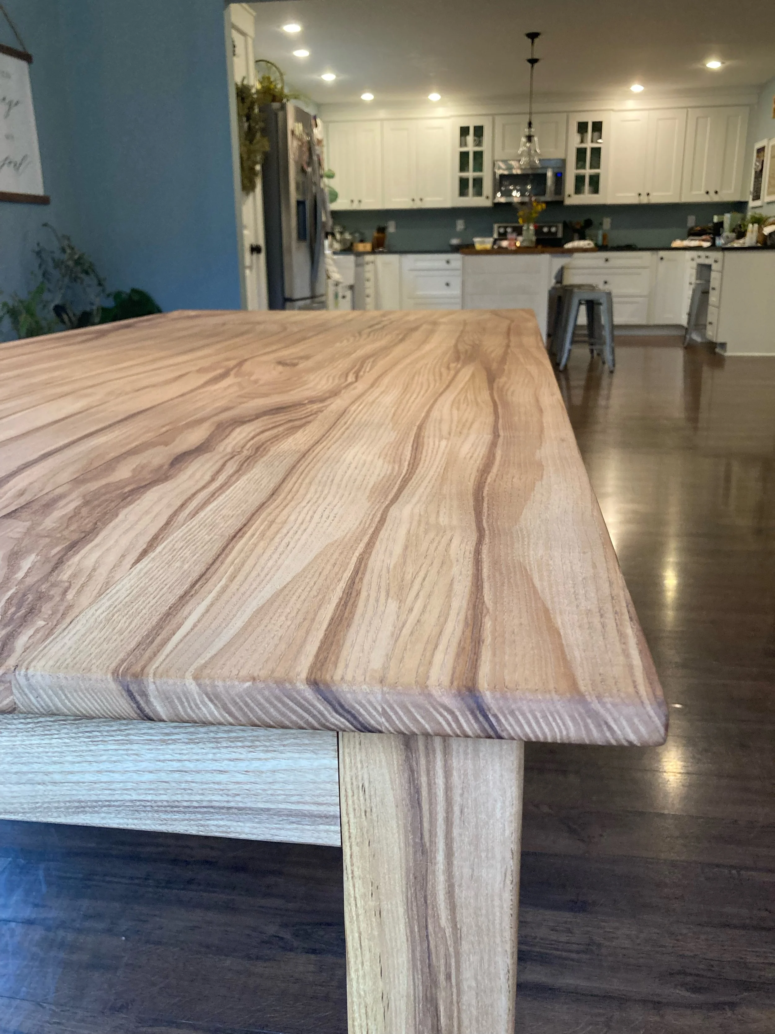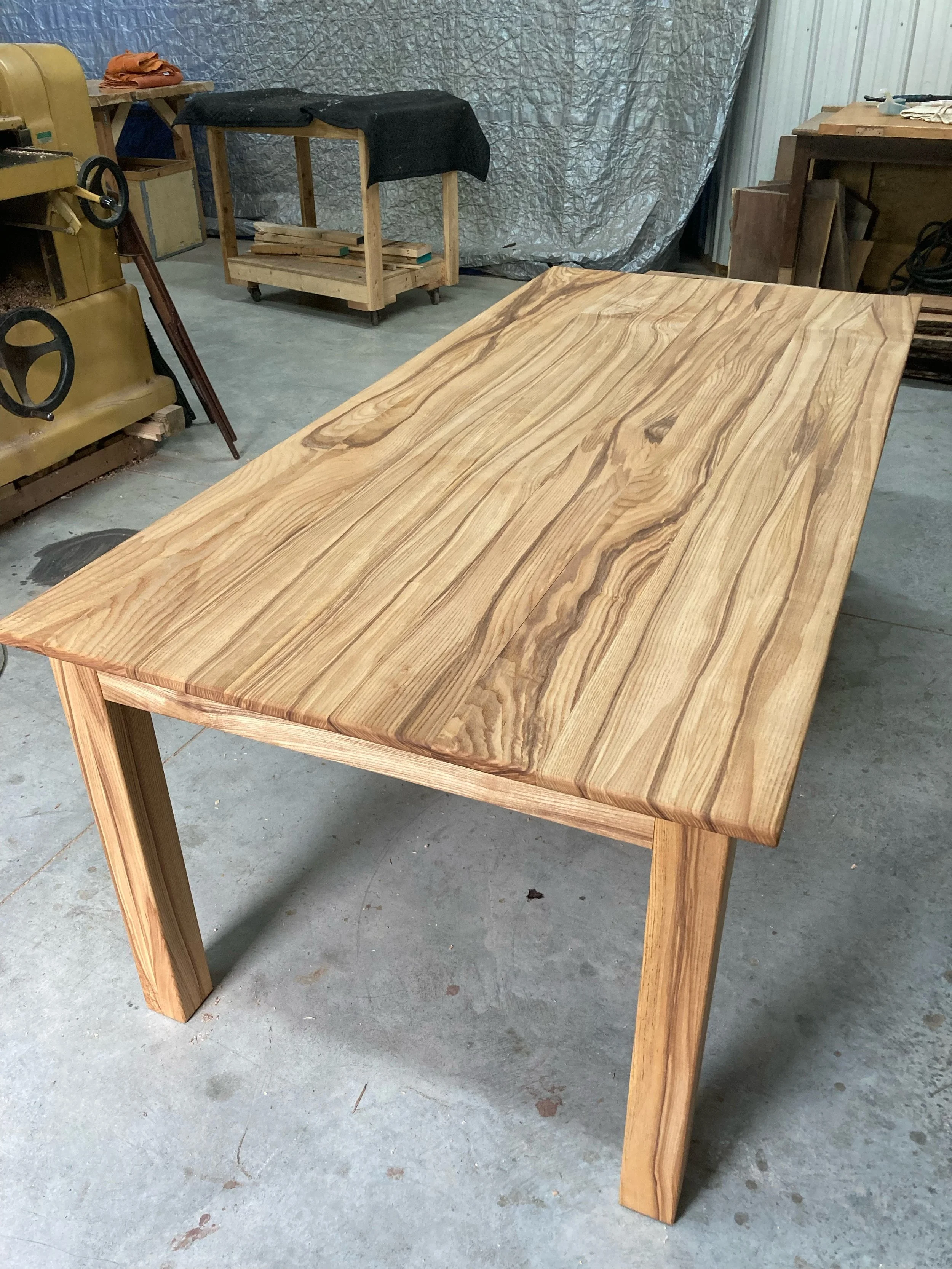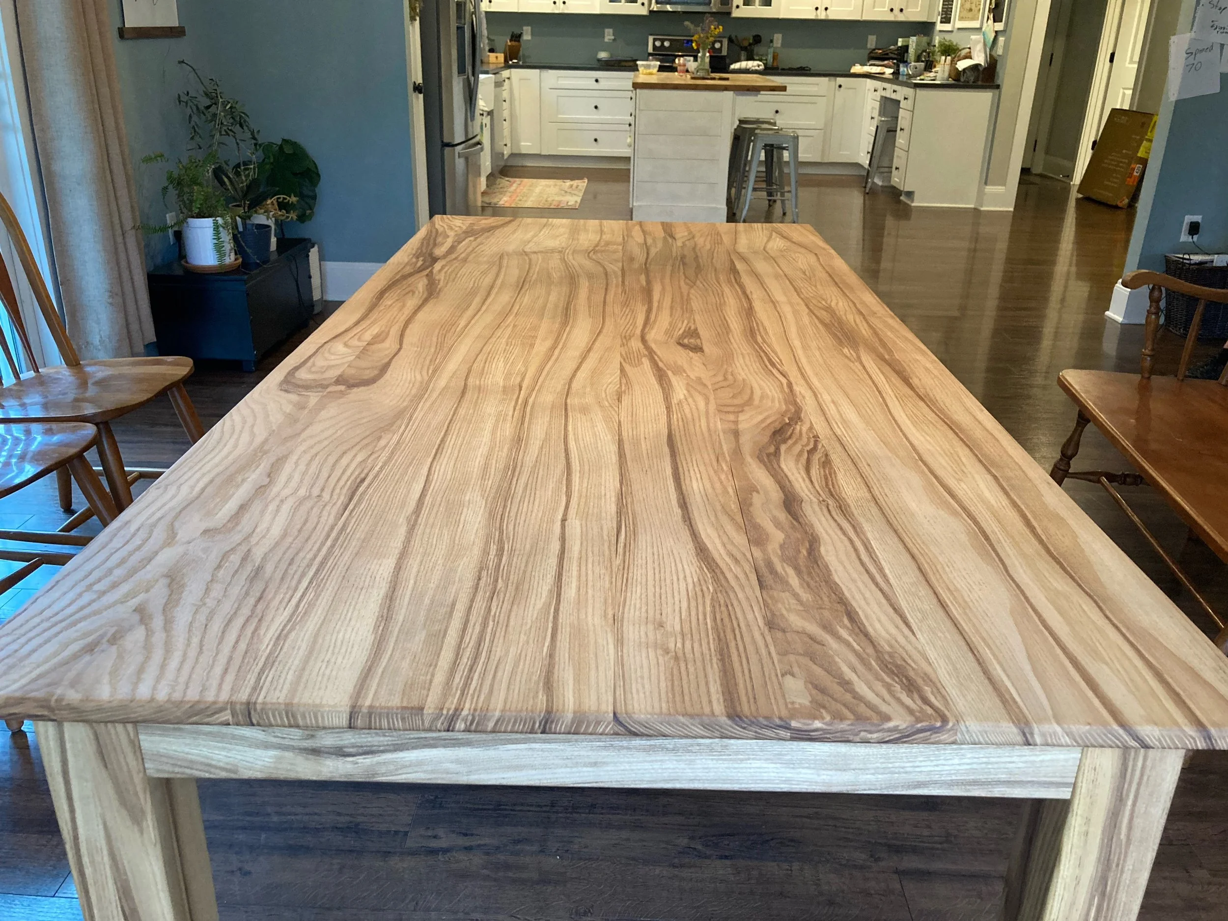 Welty Farmhouse Table This farmhouse table was built from ash trees cut down just north of the local state park. At seven foot long, it comfortably seats eight, with room to spare. The boards were bookmatched for an absolute stunner of a table!